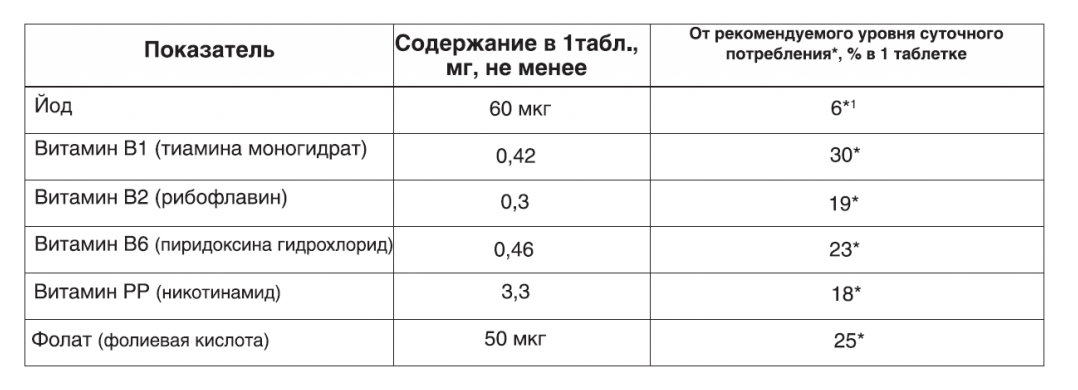взрослым по 2 таблетки 2 раза в день во время еды, что обеспечивает среднесуточную потребность в йоде, фолиевой кислоте, витаминах В1 и В6 – на 100%, витаминах В2 и РР – на 70%.