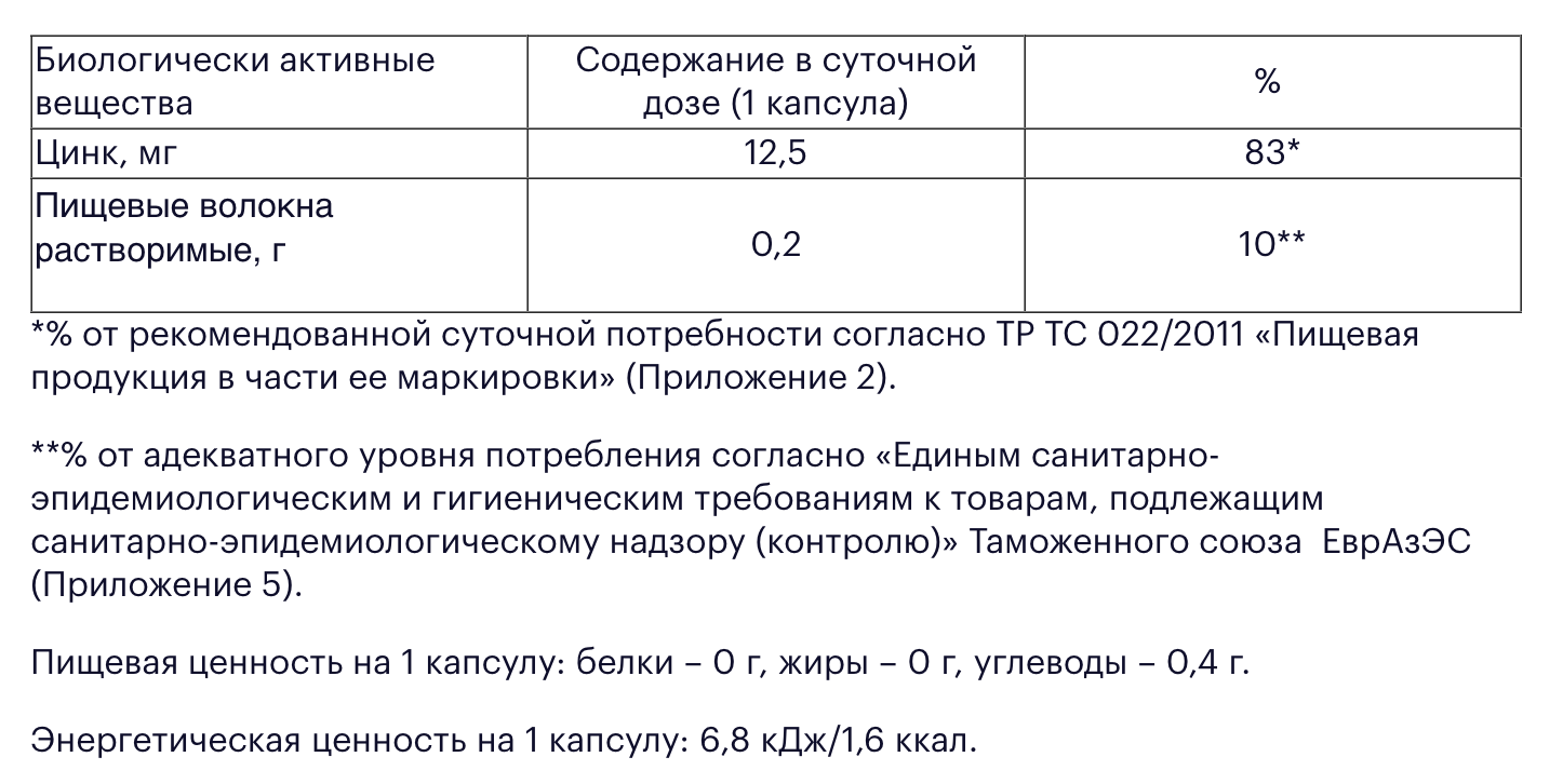 Дополнительный источник цинка. Усиленная формула — дозировка 12 мг. Всего 1 капсула в день. Укрепляет иммунитет и нормализует обмен веществ. Улучшает состояние волос и ногтей, поддерживает здоровье кожи и способствует полноценной работе мужских половых желез.