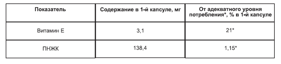 Биодобавка является дополнительным источником витамина Е, а также содержит полиненасыщенные жирные кислоты.