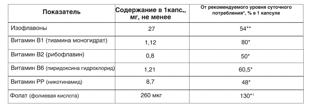 взрослым по 1 капсуле два раза в день во время еды, что обеспечивает суточную потребность в изофлавонах на 100%, в витаминах на 100-200%. Длительность курса – 25 дней.