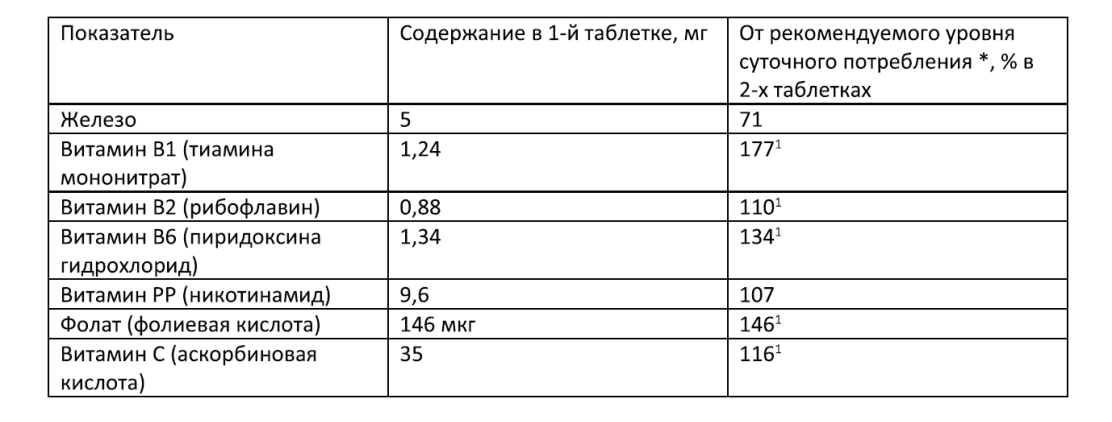 40 таблеток по 0.5 г В 1 табл. - микрокристаллическая целлюлоза (252,5 мг), лактоза (165 мг), витамин С (35 мг), железа лактат (25 мг), премикс витаминный, витамины В1, В2, Вб, РР, фолиевая кислота (20 мг), кальция стеарат Е470а (2,5 мг). Железа лактат - органическая, хорошо усваиваемая соль железа. В организме нехватка железа для нужд кроветворения проявляется железодефицитной анемией. Еще более важное следствие недостатка железа - нехватка кислорода в тканях. Быстрее наступает усталость, утрачивается способность к длительной интенсивной работе, снижается устойчивость к простудам и инфекциям, снижается концентрация внимания. Витамины В1, В2, В6, РР, фолиевая и аскорбиновая кислота входят в состав многочисленных ферментов, которые регулируют все важнейшие функции организма, включая различные виды обмена веществ. Недостаточное содержание витаминов в организме проявляется общими симптомами (ухудшение самочувствия, снижение работоспособности, уменьшение уровня антиоксидантной защиты) и нарушениями функций отдельных органов и систем. Лактоза (молочный сахар) - дисахарид, образованный остатками D-галактозы и D-глюкозы; улучшает усвоение пищевых веществ, способствует нормализации состава кишечной микрофлоры.