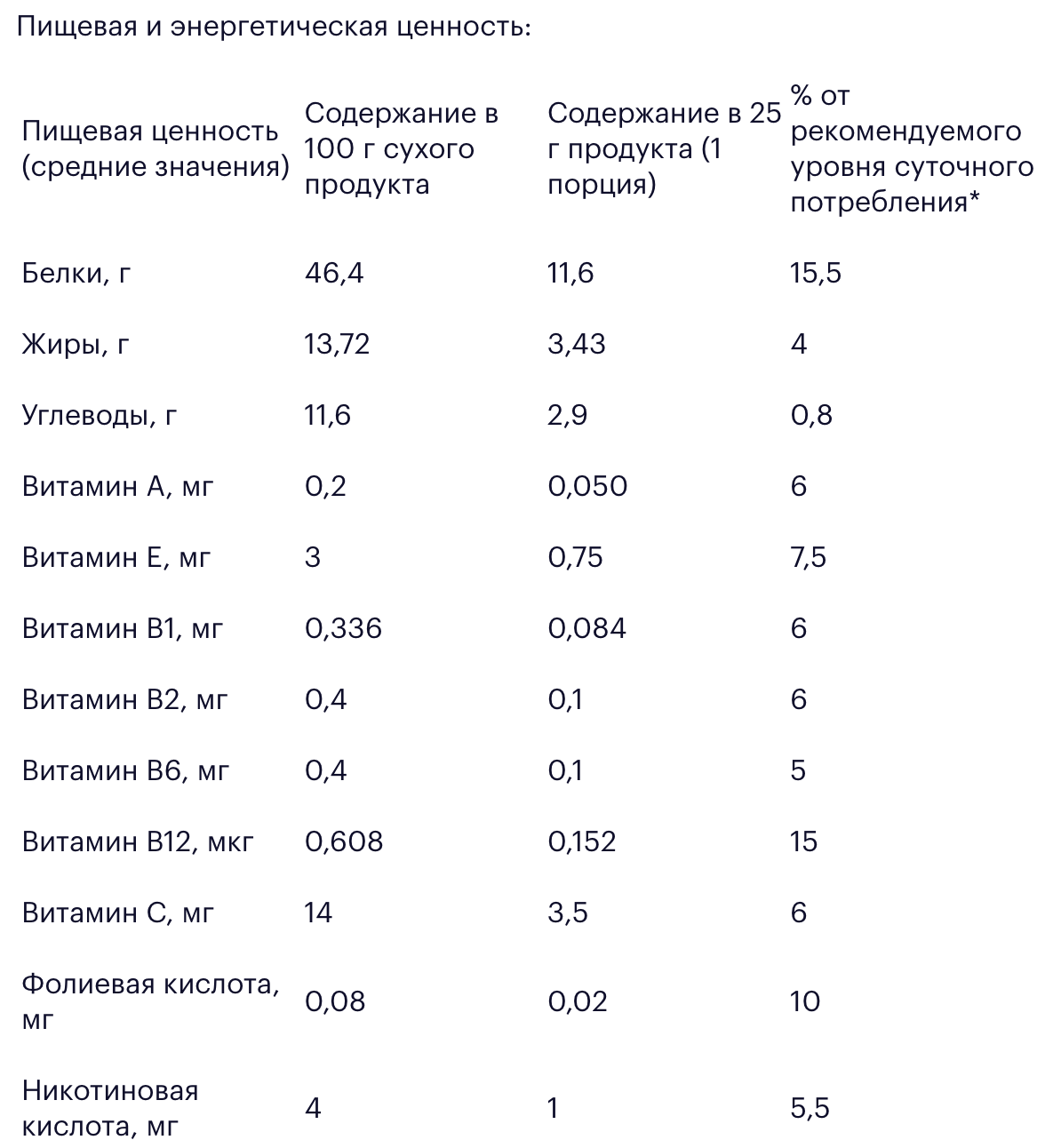 Суп богат белком, который снижает чувство голода и тягу к перекусам, необходим во время быстрого похудения, выздоровления после перенесенных болезней или для поддержания иммунитета. Обеспечение белком происходит преимущественно за счет двух источников растительного происхождения: соя и горошек, каждый из которых обладает своими преимуществами для здоровья. Они признаны и рекомендованы как часть сбалансированного питания, богатые активными полезными веществами. Их комбинация обеспечивает присутствие в продукте необходимых аминокислот. Питательный крем-суп с брокколи содержит порошок брокколи. Основные преимущества: • Высокое содержание белка около 12 г на порцию • 3 вида белка: смесь протеинов растительного происхождения и молочного белка • Низкокалорийный продукт – 90 ккал на порцию • Обогащен витаминно-минеральным комплексом из 26 витаминов и минералов • Оптимальный баланс питательных веществ • Без искусственных красителей и консервантов • Быстро готовятся